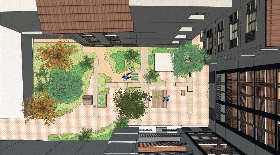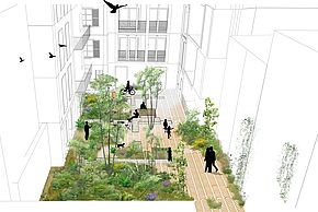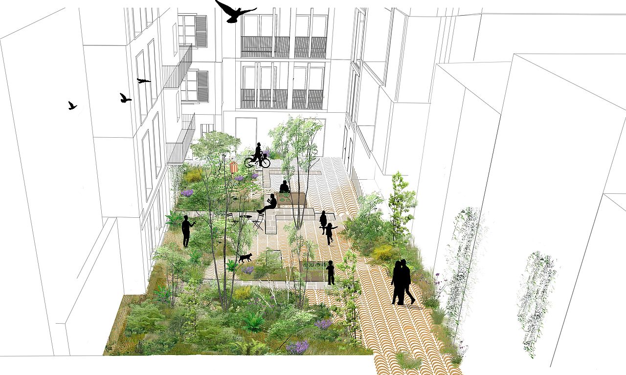 Egunean zehar lursaila bertako bizilagunen eskura egonen da, gero gauez atari baten bidez hetsia izanen da, bizilagunen lasaitasuna bermatzeko. Sinbolikoki, Baiona historia eta ondare-hiria delako, lurreko markek uhartetxoaren bihotzean suntsitutako eraikin baten edo eraikin zati baten trama zaharra jasoko dute espazio horretan zehar. Azkenik, mugikortasun leuna da proiektu honetan bultzatutako beste bektore ekologikoetako bat Cordeliers karrikara begira dagoen bizikleta garajea sortzeak, auzoko bizilagunentzat. 45 uhartetxoko bizilagunek kutxak izanen dituzte eraikin bakoitzaren barnean.