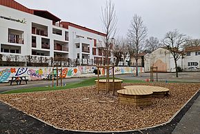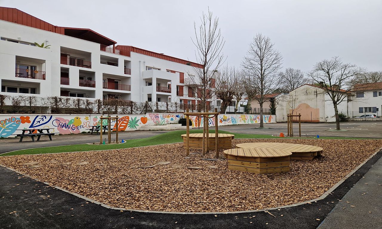 Saint-Etienne auzoan kokatua, Aristide-Briand eskolako patioa guztiz asfaltatuta zegoen eta jolastokia erabat degradatuta. Joan den otsailean Berdeguneen sailaren esku-hartzearen ostean, 150 m² asfalto kendu, bost zuhaitz landatu eta joko berriak instalatuak izan dira. Landesetako pinuaz eginak, Hiriko arotzek diseinatu dituzte.