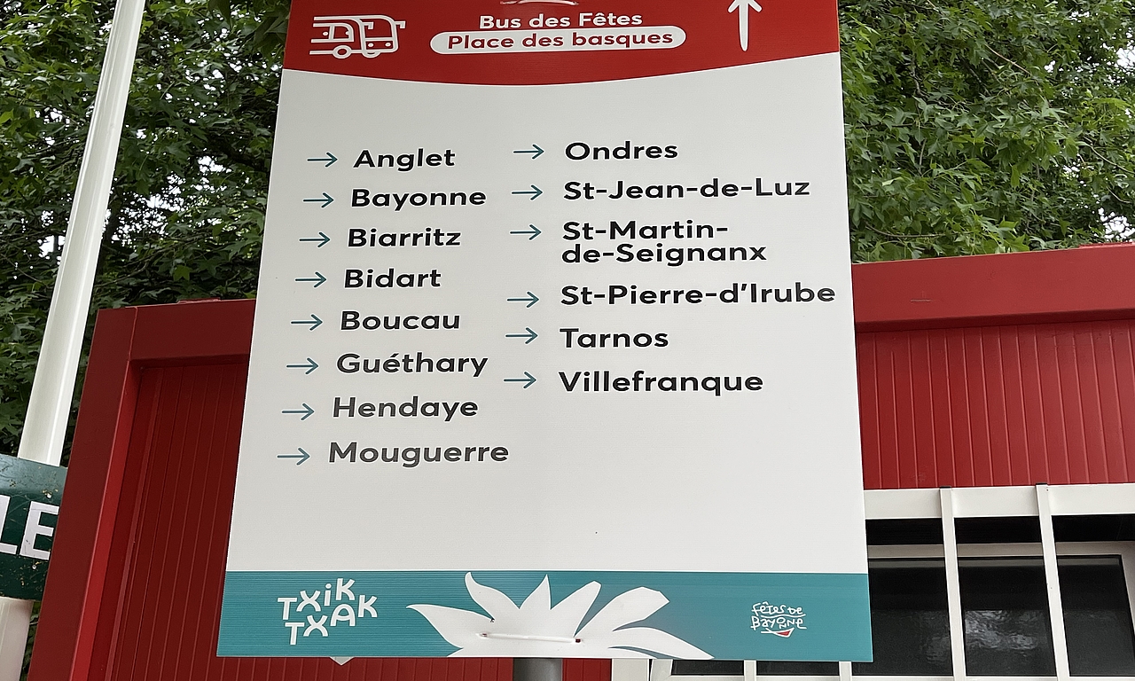 En fonction des destinations, les gares routières différent : l'une est située place des Basques pour desservir les villes du sud de Bayonne, tandis que les bus desservant l'intérieur du Pays basque partent du quai de Lesseps © Ville de Bayonne MobilitésVenir en transports en communPour venir aux Fêtes, il est conseillé de venir en transports en commun. En bus avec Txik Txak qui a renforcé ses fréquences ou en train avec la SNCF.Data honetan argitaratua 09 July 2025 Pour venir en train > fetes.bayonne.frPour venir en bus > txik txakBerri guziak